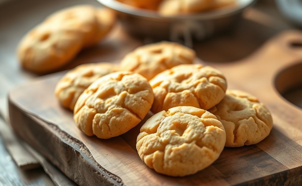 Biscoito de tapioca fit dourado e crocante disposto em tabua de madeira, textura perfeita para lanches saudáveis