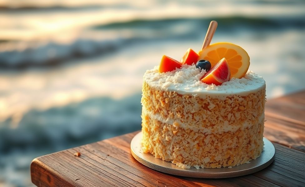 Bolo de Aniversário Praia: Massa Úmida com Coco e Frutas Tropicais Perfeita para Celebrações