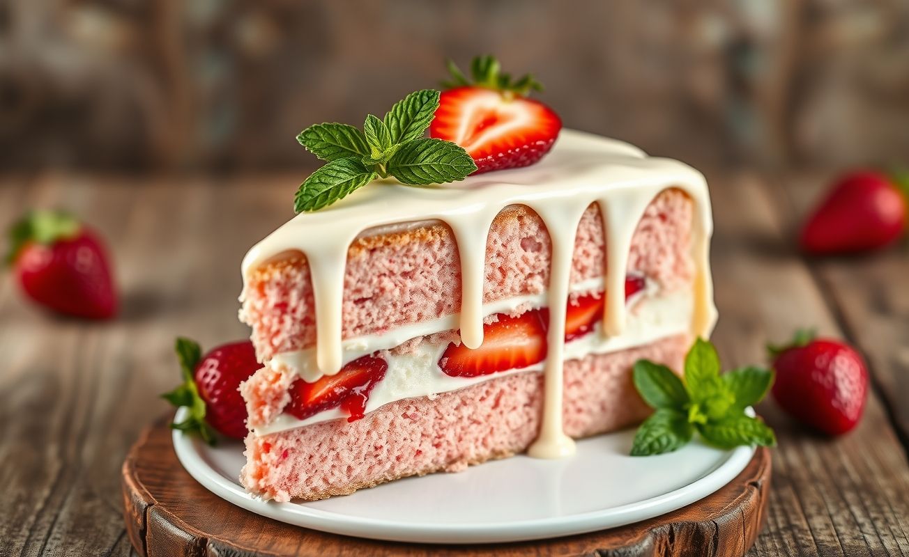 Bolo de morango estética cortado mostrando camadas perfeitas de massa rosa, creme branco e morangos frescos com cobertura brilhante