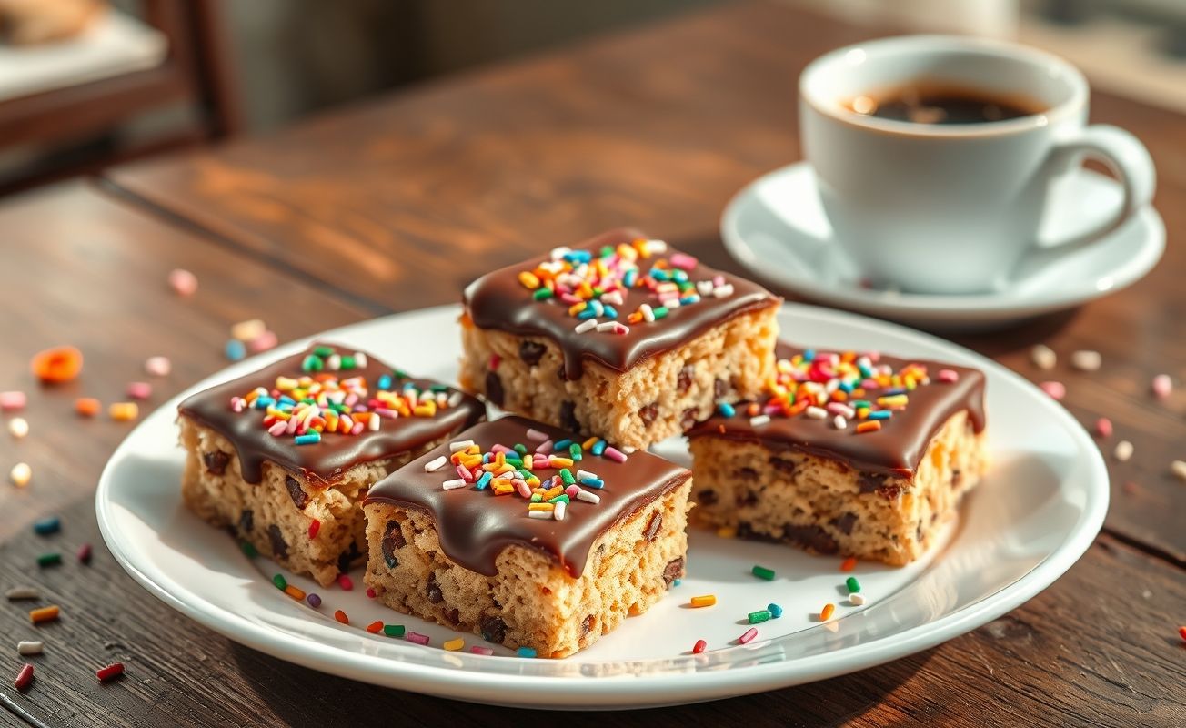 Palha Italiana tradicional cortada em quadrados, coberta com granulado colorido sobre prato branco, mostrando textura crocante e cremosa
