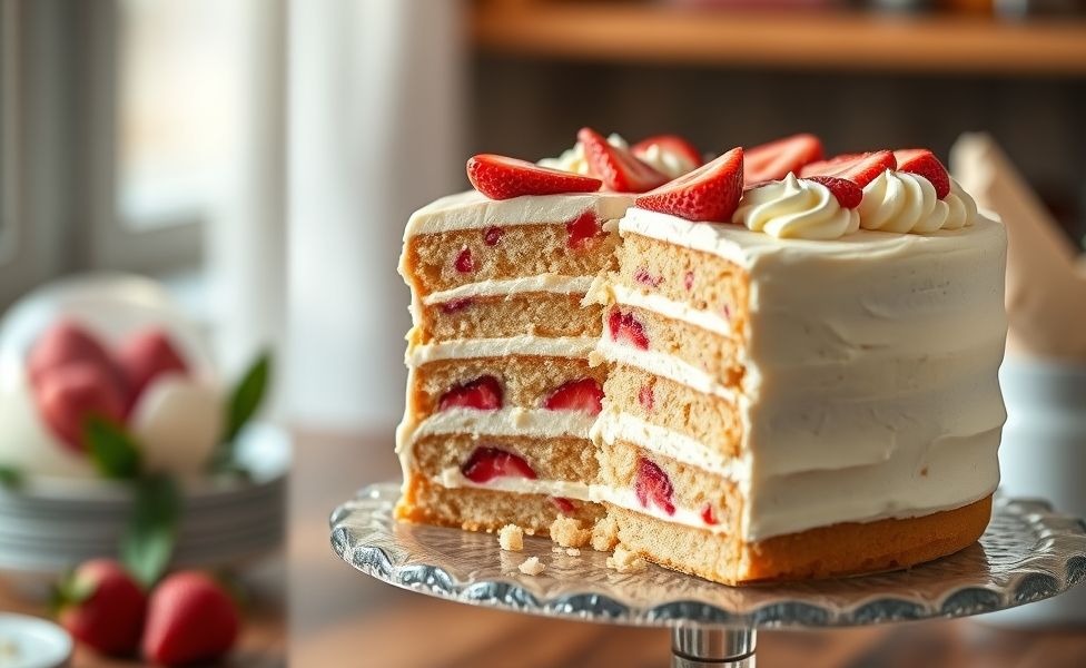 Fatia de bolo de aniversário mostrando camadas cremosas de recheios para bolos de aniversário com morangos e chocolate branco